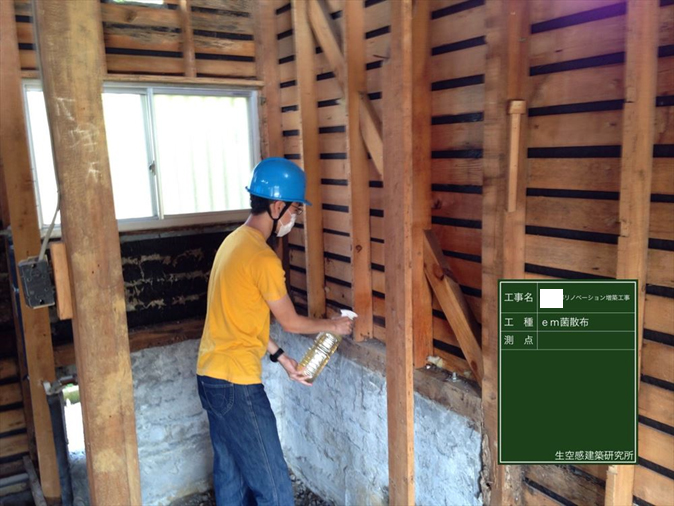 解体時、建物内のカビの臭いが洋服につくほどきついこともあり、施主に提案し実験的に活性液噴霧を試みることにしました。その結果効果は絶大で噴霧直後からカビの臭いが抑えられました。噴霧直後に訪れた現場監督がすぐに、臭くないと驚いていました。