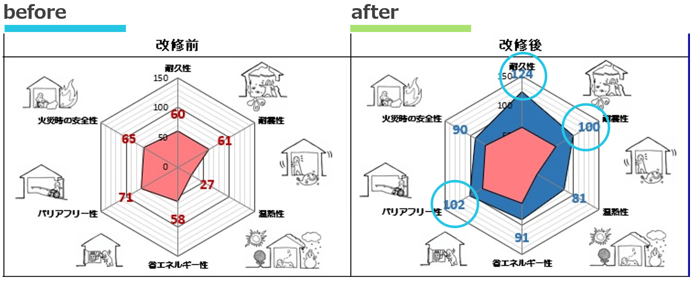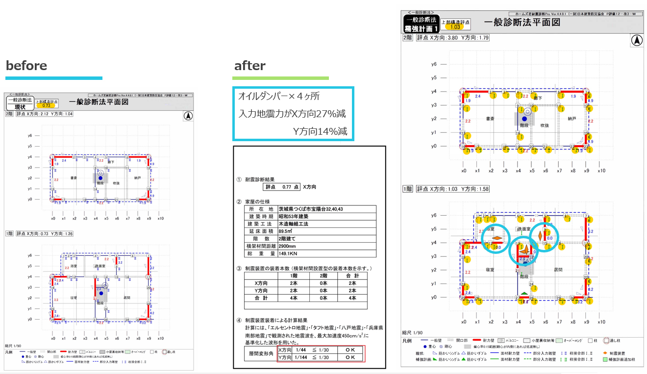 上部構造評点は 改修前0.73 → 改修後1.03に改善した。