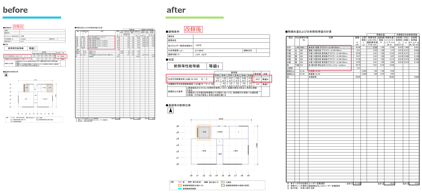 UA値(w/㎡ K)改修前 等級 1 → 改修後 等級 4