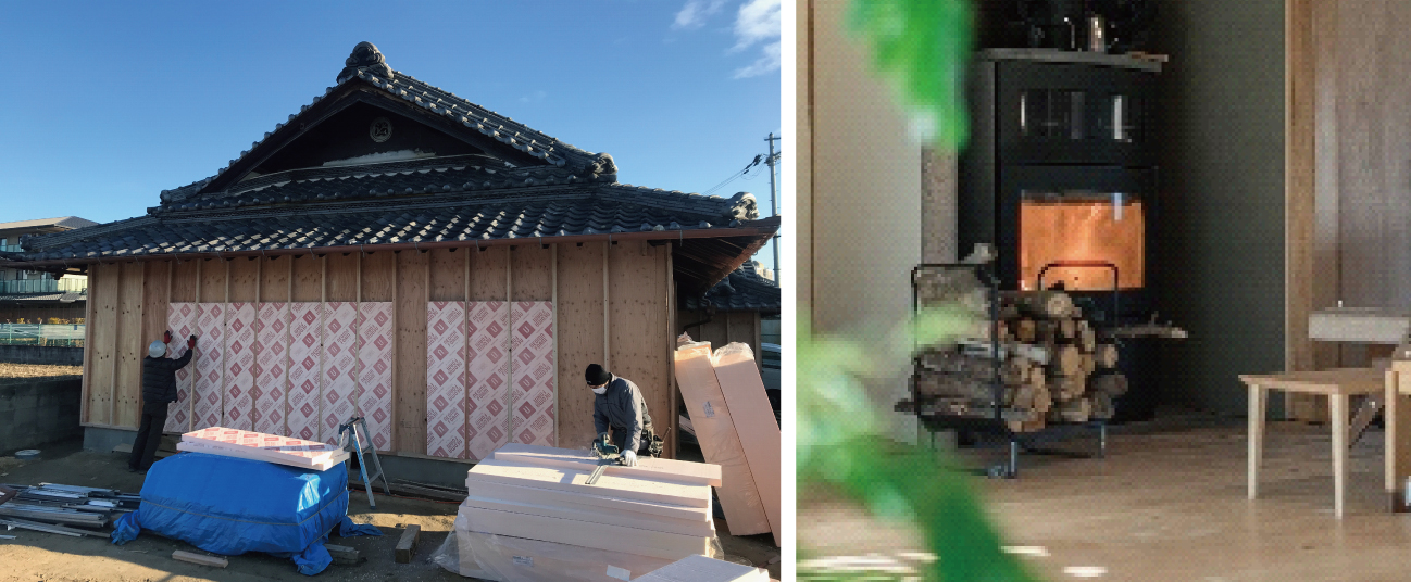 もともとあった外壁の土壁、解体が不要なところはそのまま残しました。土壁面に合板を施工し耐力壁として計画。その外に断熱材を施工する付加断熱の工法を採用しました。そうすることで、内部にある既存の土壁は、断熱材よりも室内側に存在するため蓄熱層とする計画です。