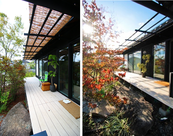 ベーシックな日本建築は元来よく考えられていて、既存の窓位置、軒の出から大きく変更せずとも、日射遮蔽はほぼできていたが、季節に合わせて『すだれ』でさらに影をつくり、エントランスの雑木林は落葉樹を中心に選定し、季節の移ろいを感じられる設計としている。