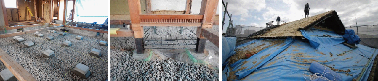基礎補強、瓦の土を下ろし軽量化によって耐震評点2.2を確保