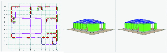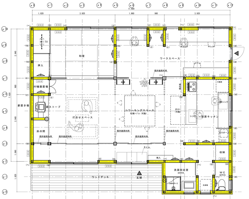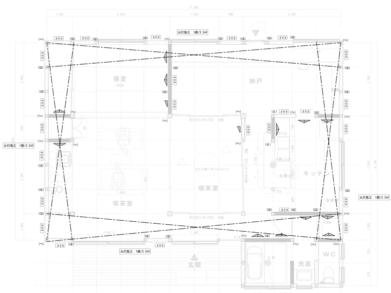 壁面補強![]() 耐震計算上バランスを見ながら、筋交い、面材を使用。 |
