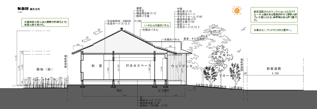 既存の軒の出を変えずに南面の日射遮蔽はできている。東西の窓は『シャッター』『すだれ』で日射を調整する。