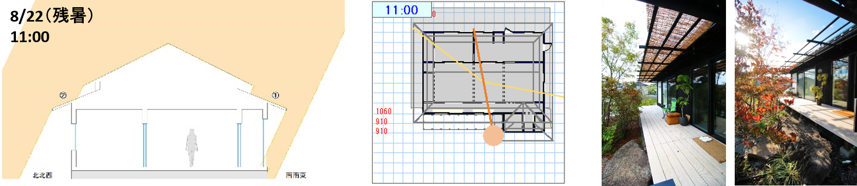 敷地が少し西に振っている関係で、8月中旬からは南面からも直接日射が入る。残暑の時期は、『すだれ』で影をつくることが特に有効になってくる。