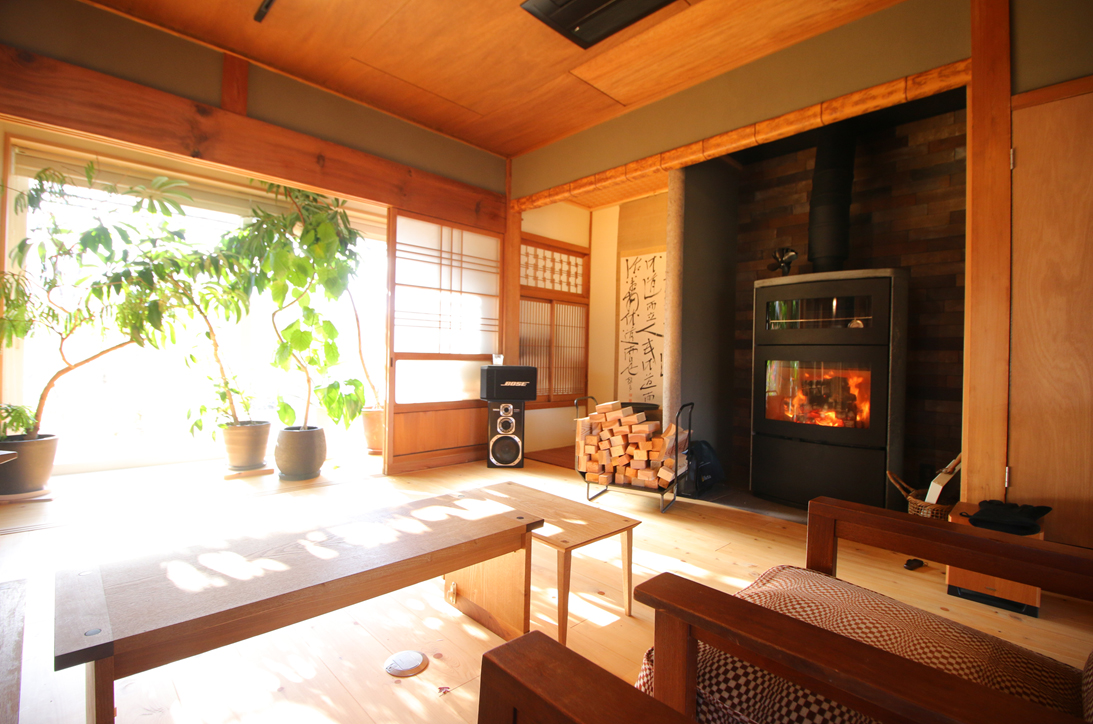冬は薪ストーブ1台で家の隅々まで暖房する。薪は近隣の公園の伐採木と、建築現場の廃材でまかなっている。