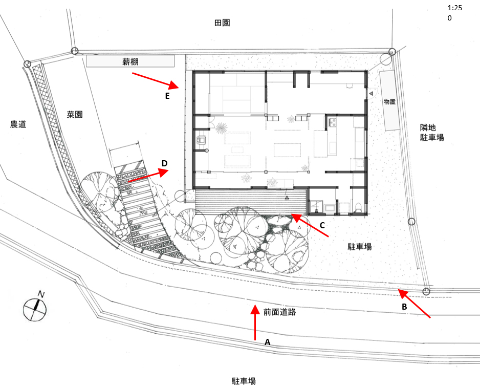 既存の家は、外壁南面は窓が配置されていましたが、道路に対してコンクリートブロックでふさがれ、また、南側にサンルームを増設されていたこともあり、閉鎖的な印象がありました。家を地域に開きたい、というコンセプトがありましたので、それらをすべて撤去し、南面に雑木林を造って、森の小道を入ってゆく、オープンインの形で計画しました。