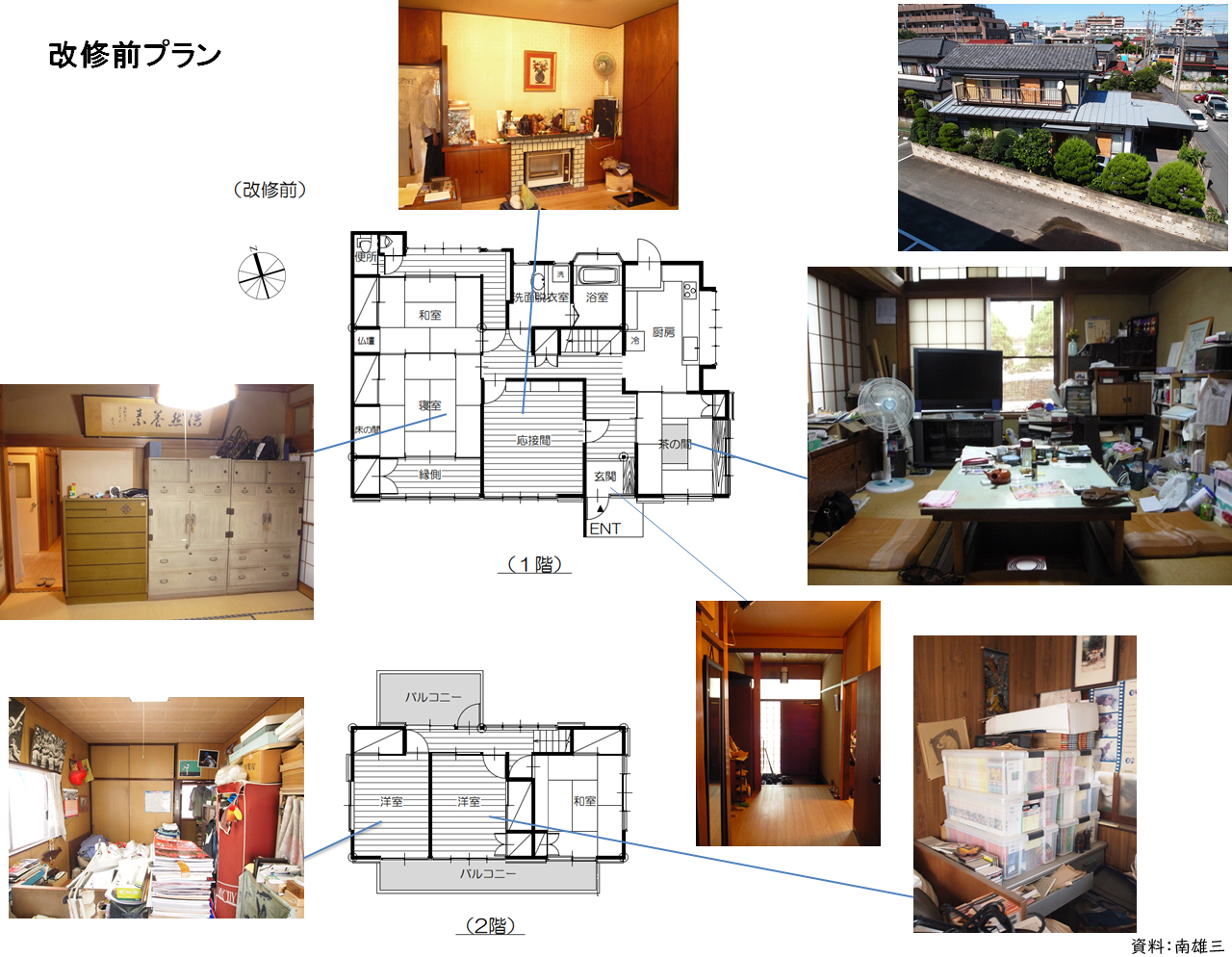 改修前の間取りは、各部屋への動線が悪く部屋が分断されていたた。改修後は各部屋へのつながりと使いやすさが改善した。1階西側の和室は高齢者の寝室としても使われていたが箪笥が並んでおり箪笥の収納場所を増築した。茶の間からは北側の庭を眺めることも出来る。1階南側半分は来客者も利用する共有スペースとなった。