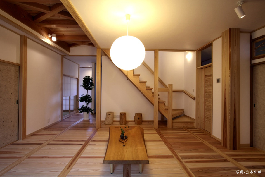 断熱性能を上げることにより日と風を全体に配る開放的な間取りに、断熱戸で冬は熱が逃げるのを防ぎ、夏は日射を遮る閉鎖的な仕切りができる。