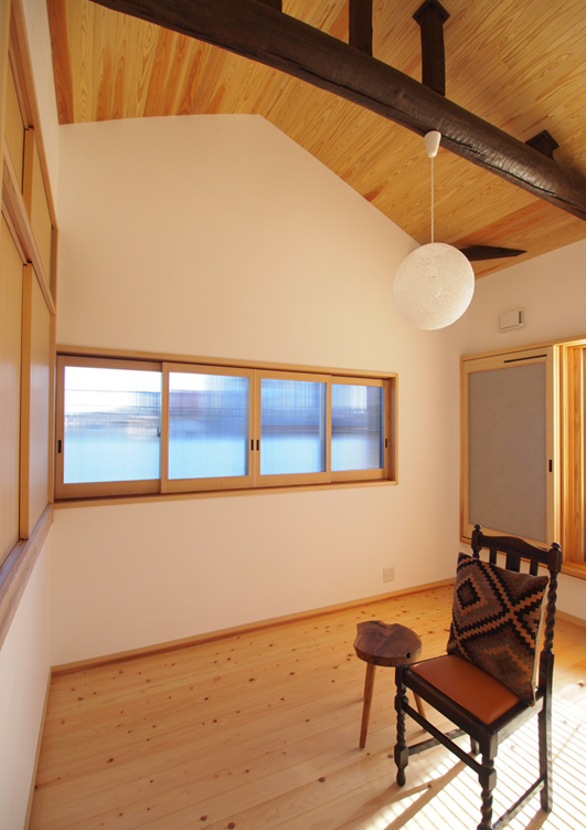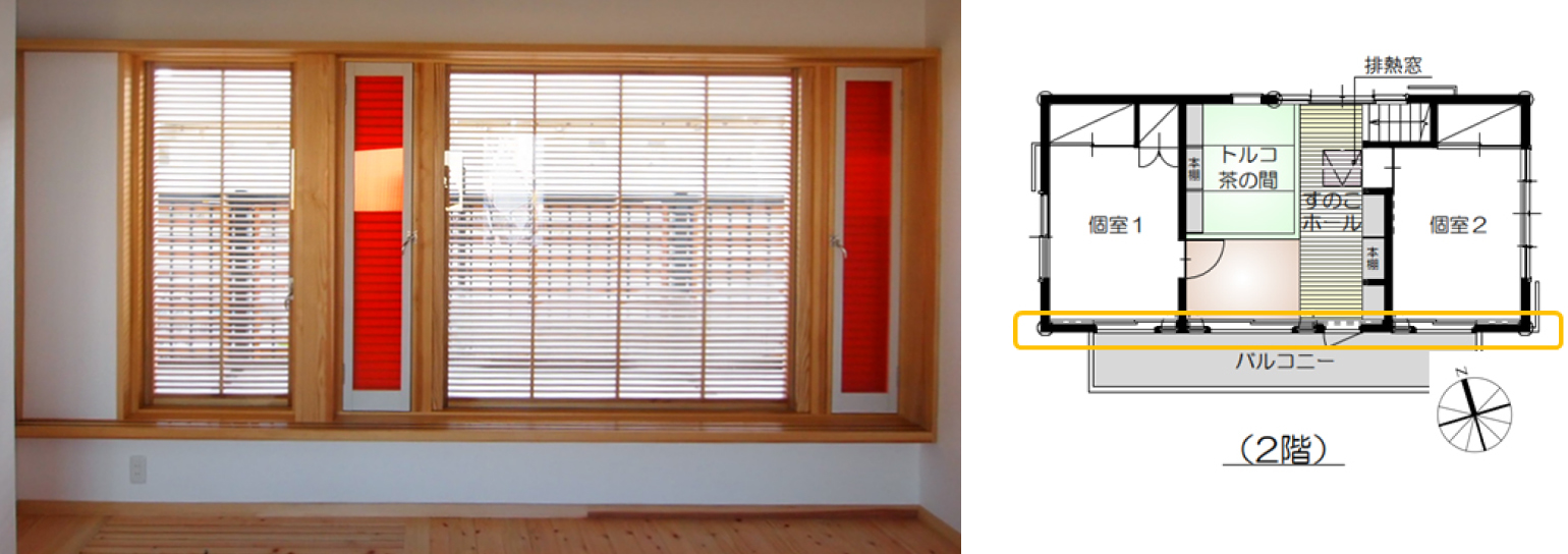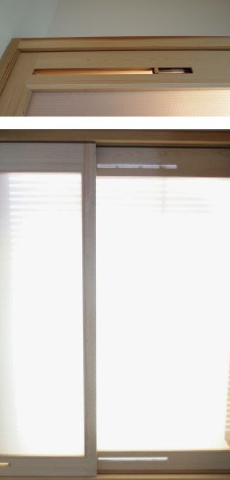 C![]() 2階南の窓はFIX窓の脇に断熱通風戸を設置して、夏は通風、冬は閉めて断熱を図る。 |