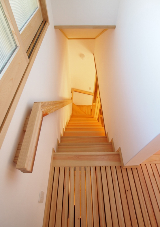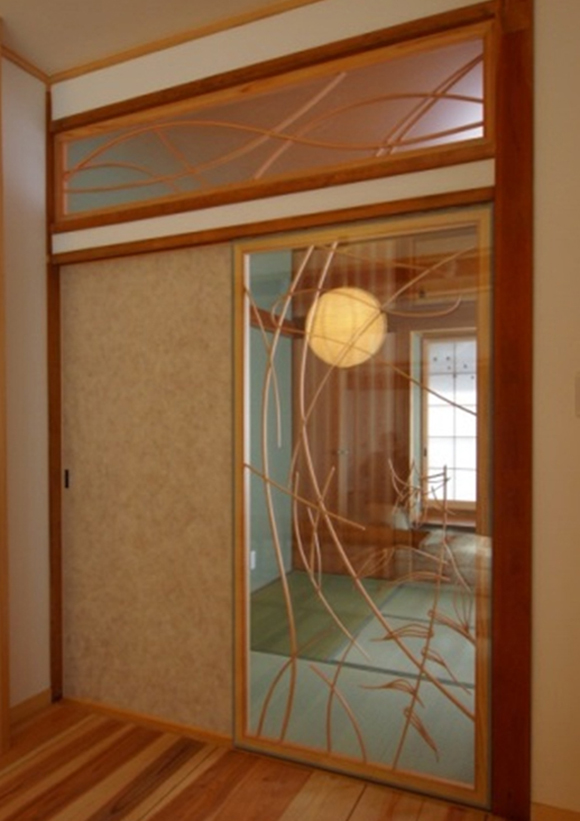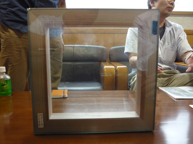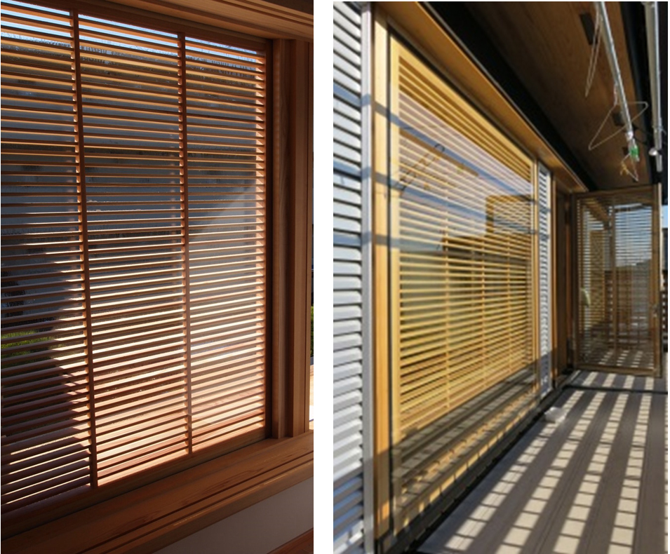 A ![]() 2階南のFIX窓は木枠の両面に5㎜のガラスを接着剤で固定するもので、中に木製ガラリを挿入してプライバシーの確保と日射遮蔽を実現する。 |