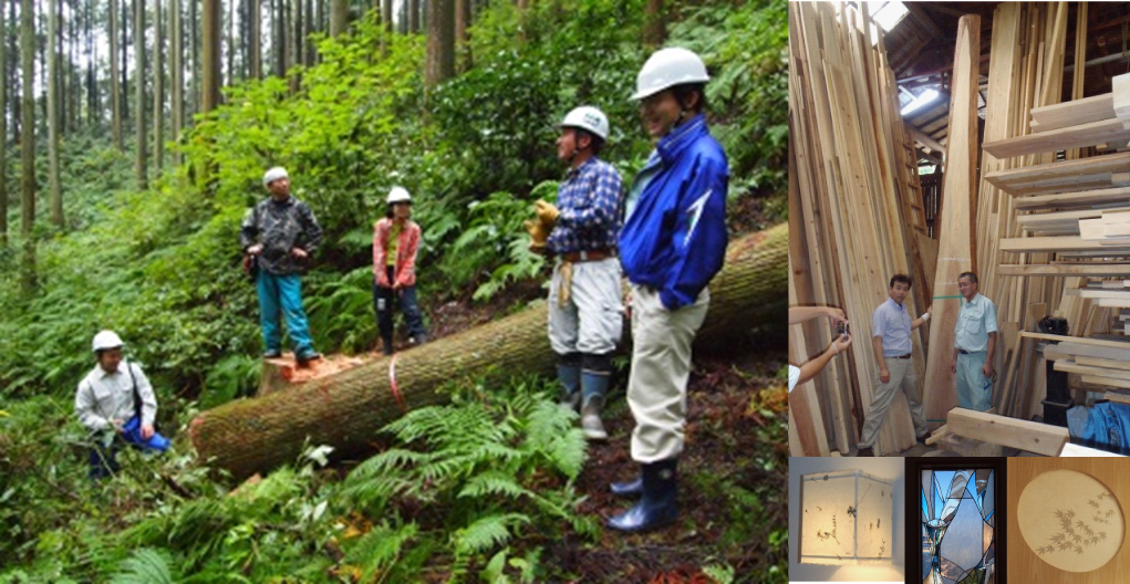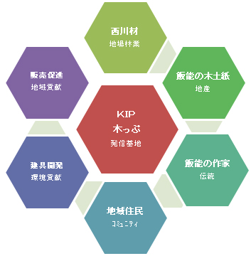 森に入って自分で伐採体験をし西川材の森林組合の木を大黒柱に使い、飯能の紙ですいた草花をちらした和紙が照明、障子に使われ、飯能の土で焼いた手洗いがぬくもりを伝える、飯能のステンドガラス作家の作品が目を楽しませてくれる。加藤さんは「KIP」を新たに「木っぷ」と名付けた。多目的広場では和紙、陶器の展示会、見学会、セミナーが開かれてパッシブ改修、パッシブ建具開発を伝え社会、環境に貢献するとともに西川材、飯能の魅力を伝える発信基地となり地域の人々をつなげる場になっている。