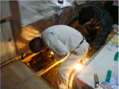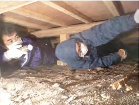 建物詳細調査![]() 住まい手の加藤さんと共に床下を調査する(右 南先生) |