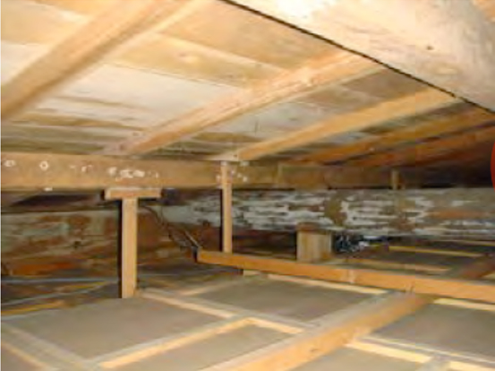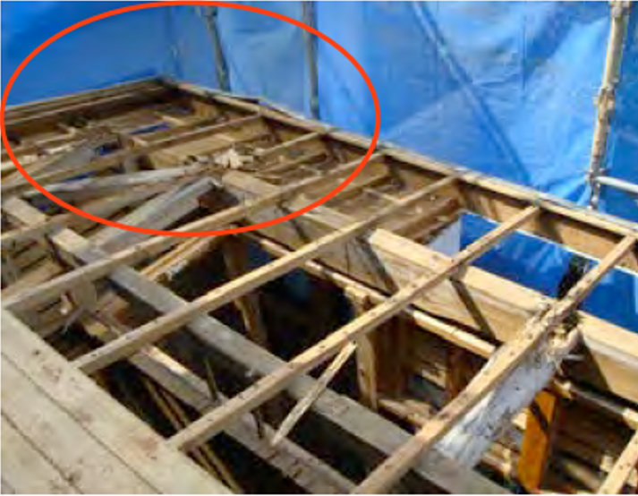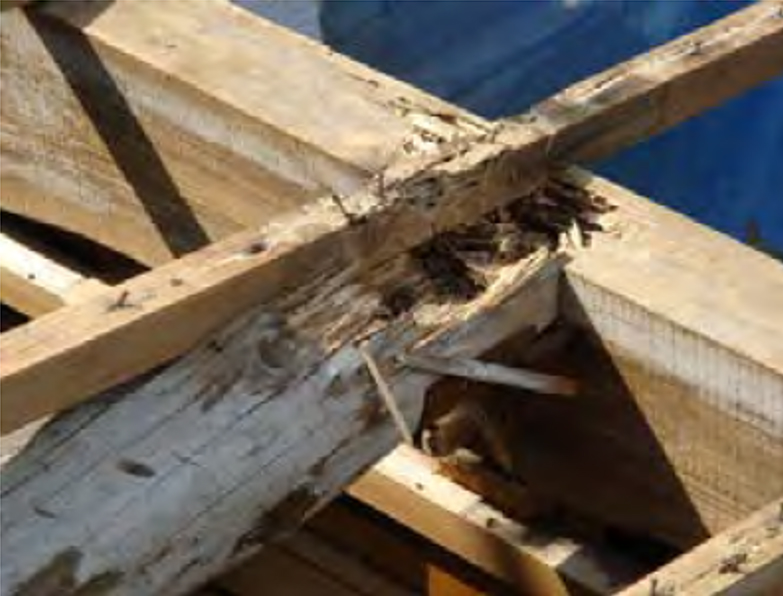 小屋裏の状態はとてもよいが、小屋裏で一部の梁及び野地板に白色腐朽菌がみつかり、特に北西角の一帯で、後日屋根を剥がしたところ3mの高さまで白蟻の被害が激しかった。