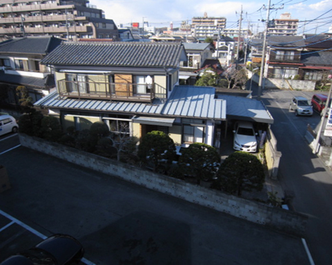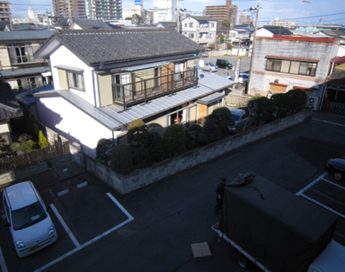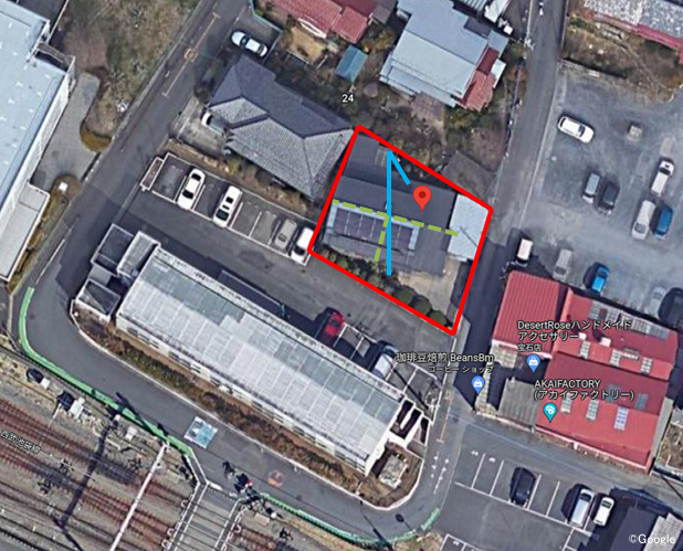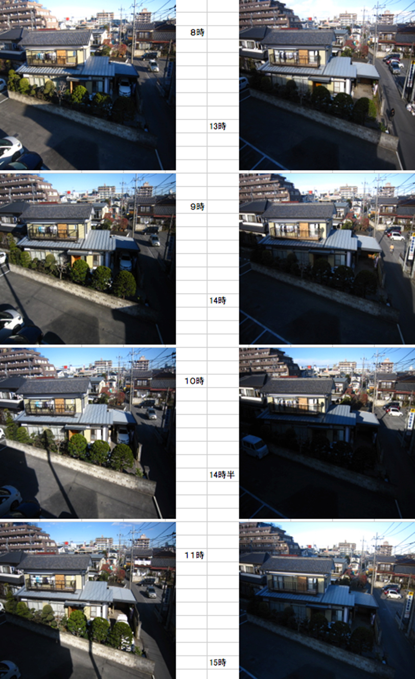 建物の敷地は、南面に駐車場と3階建てマンション、東面に元工場がある。建物の形状は、1階に下屋が廻り セットバックして2階が乗っている。写真は北が上。建物への日射しの状況写真をいただいた。