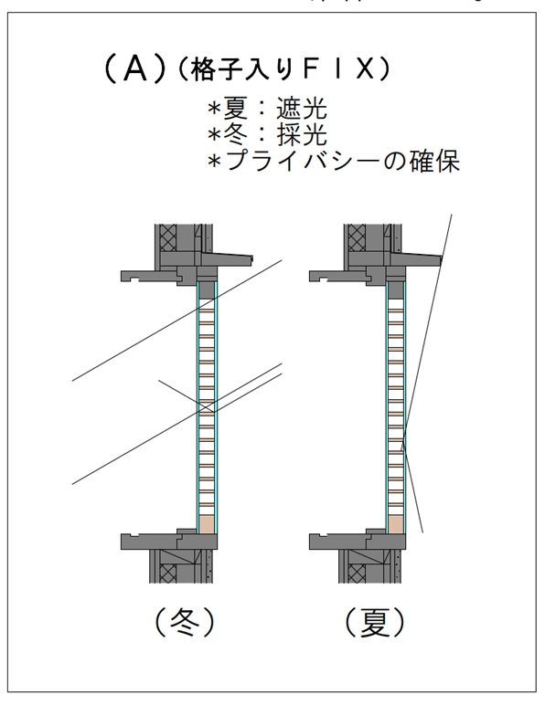 ① 冬は日射を取入れたいが、夏は日射を遮蔽したい。→A 格子入りFIX