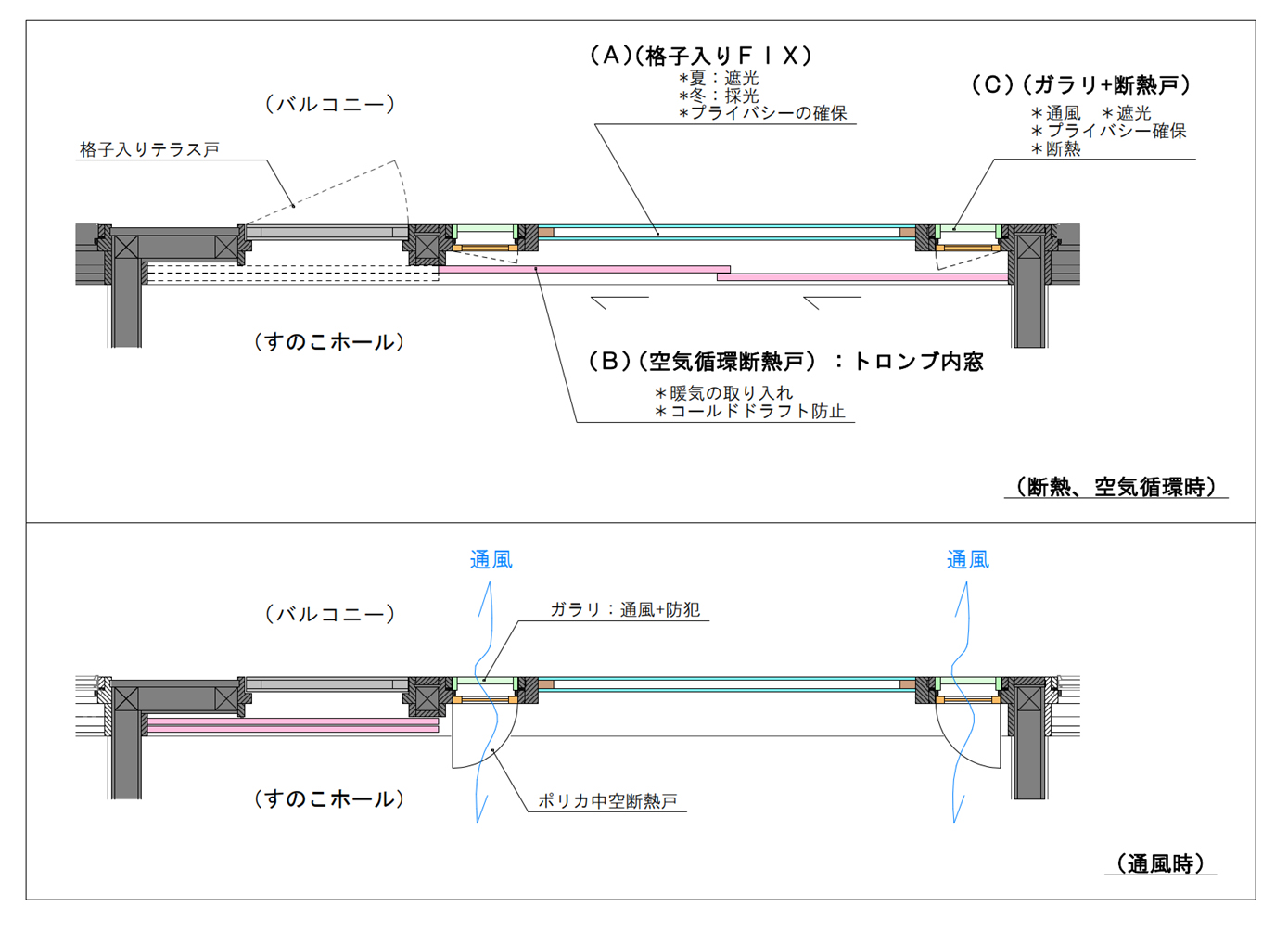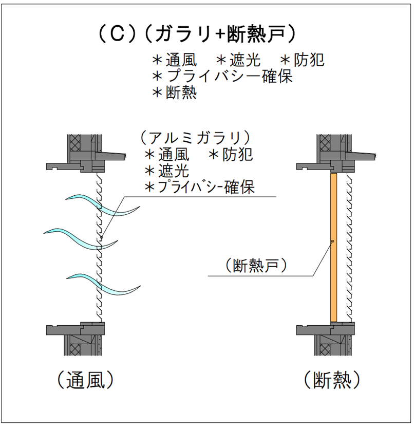 ③ 冬に日差しがある時は取り込みたいが、なくなれば断熱したい。→B 空気循環断熱戸