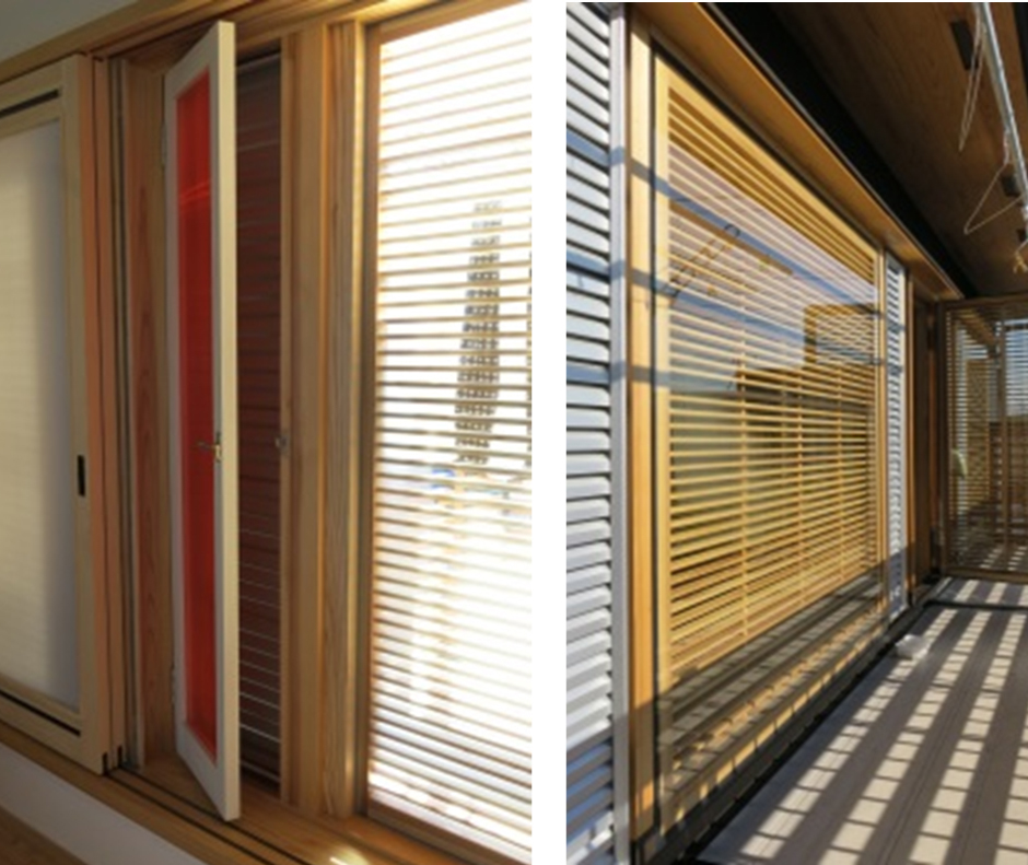 | 【 パッシブ窓に求められる性能 】 ① 冬は日射を取入れ、夏は日射を遮蔽する。 ② 冬に日射を取入れながらもプライバシーは確保する。 ③ 日差しがある場合は取り込みたいが、なくなれば断熱になる。 ④ 夏に窓を開けながら防犯、プライバシーを確保する |