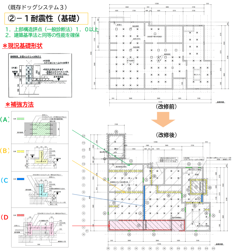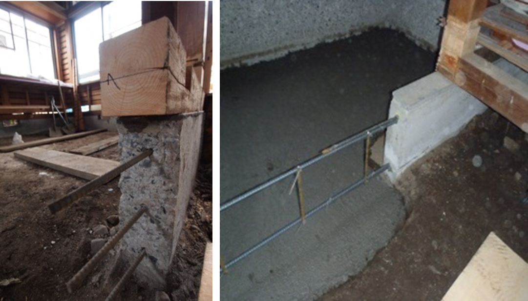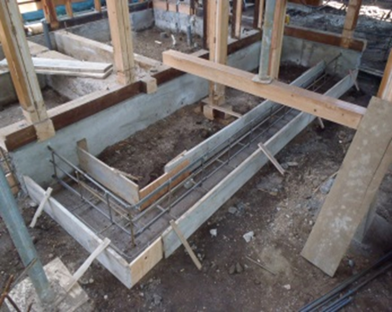 基礎梁間が大きい部分、耐力壁、新設壁部分には布基礎を打ち増しする。
