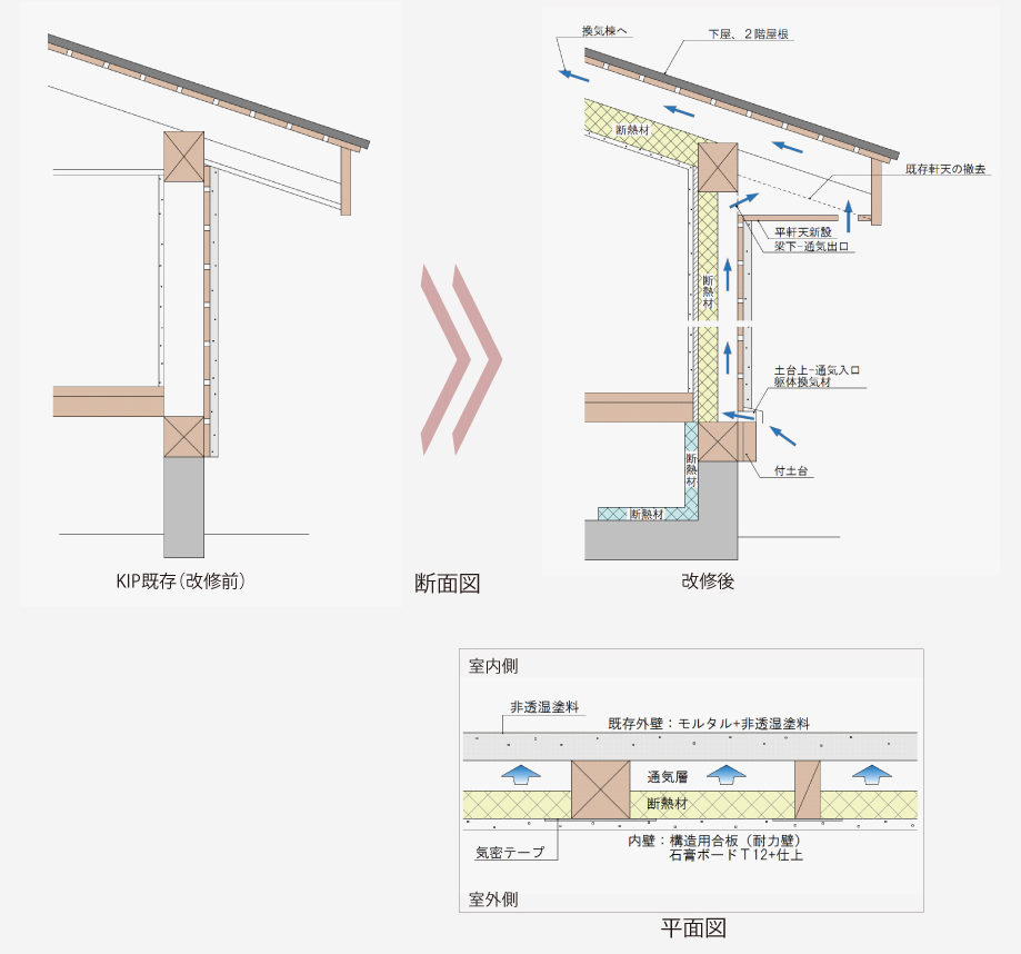 外壁面に透湿性の無い塗装がされたばかりで、外壁は触らずに建物内部から断熱材の施工や壁内に入る湿気を通気する方法を検討した。