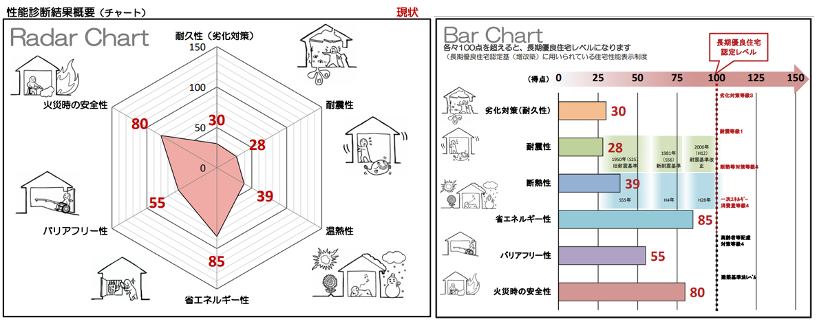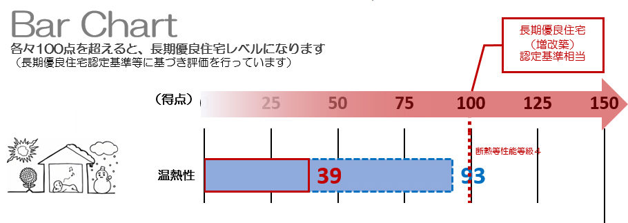改修後の温熱性能![]() 温熱性能 BarCrart 改修前39点 → 改修後93点(長期優良住宅レベル付近) |