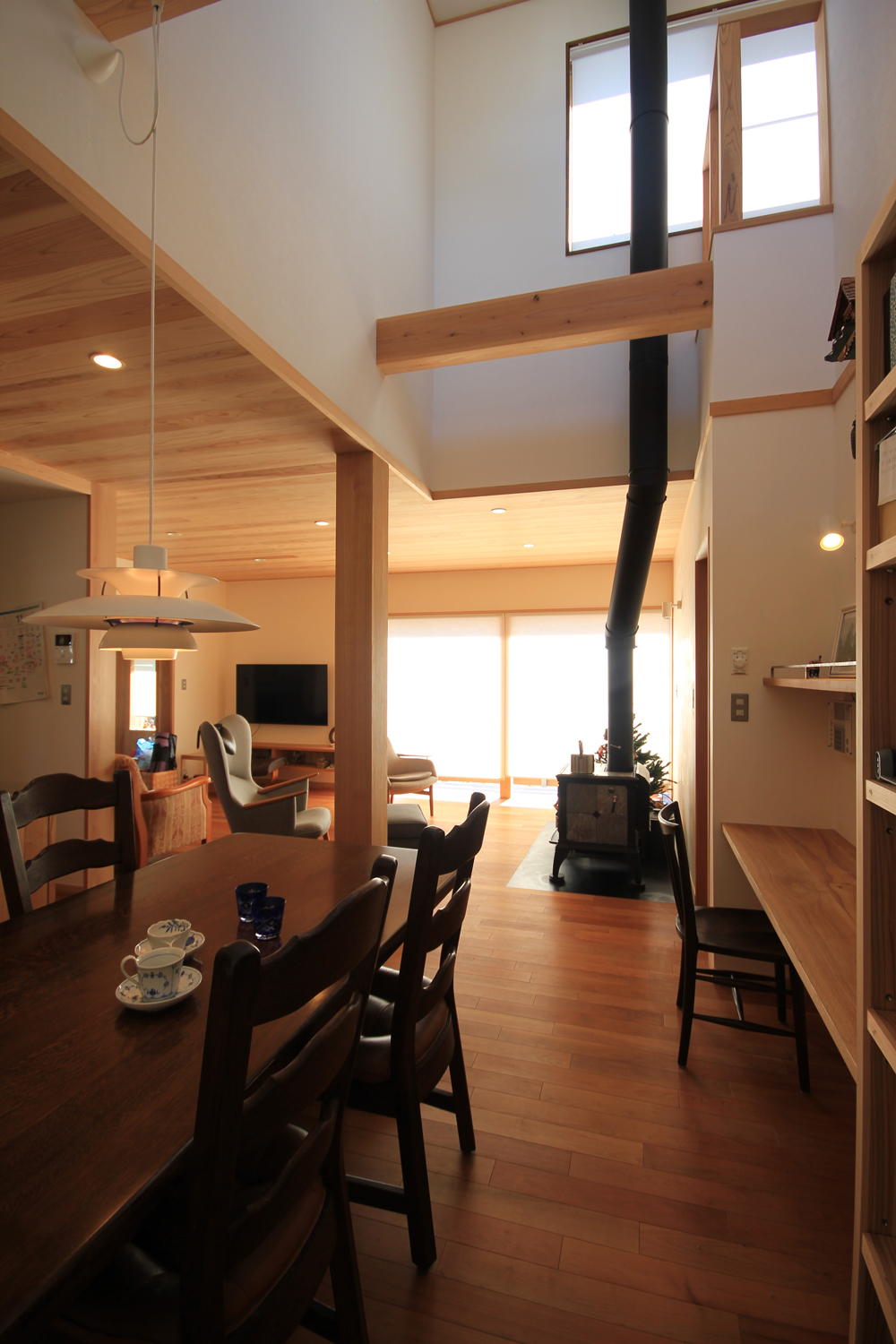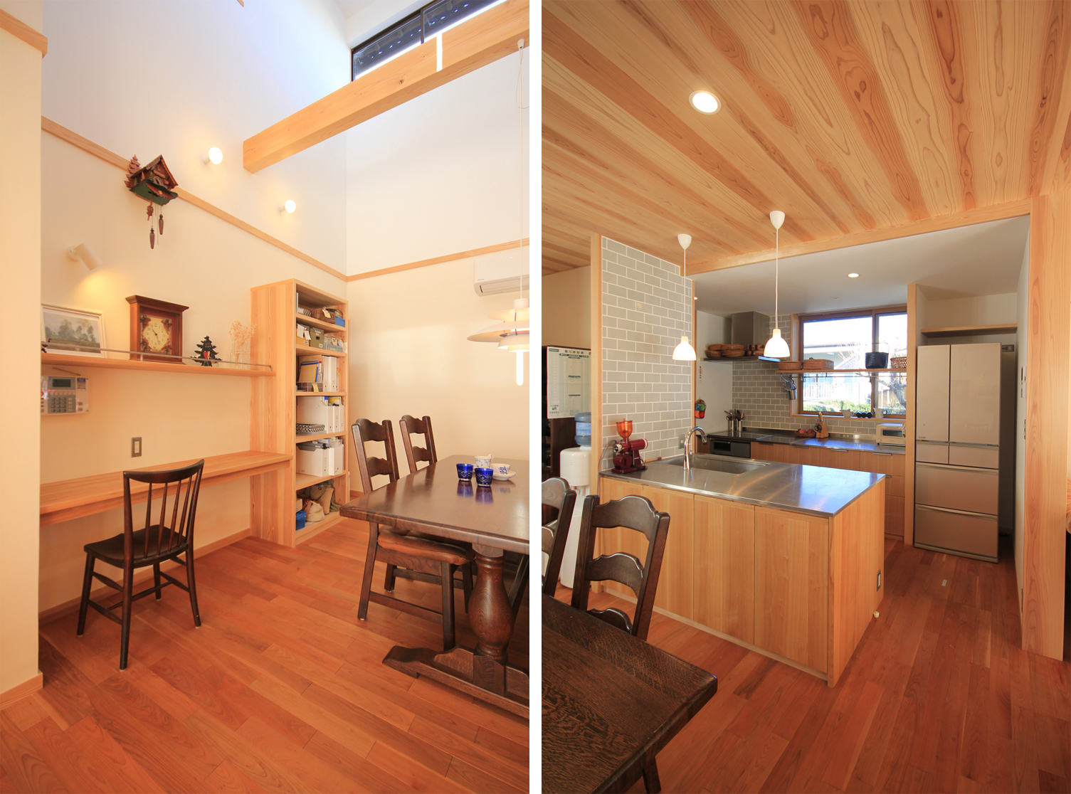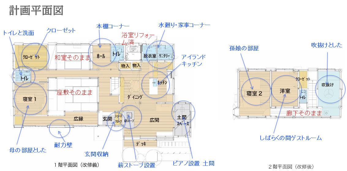今回の計画は、主にリビングやキッチンなどの生活空間を中心に行った。プランとしては大きな変更は無いが、キッチンから水廻りの動線を確保し、中廊下をやめて収納を充実させた。また、暗かったダイニングの2階床を取り外して吹抜けとし、お母さんの部屋を1階に設けトイレや水廻りを近くに配置した。お母さんが一人で暮らしていた家だが、改修後は家族が増えることを想定して、家族みんなが快適に暮らしていける間取りをご提案した。