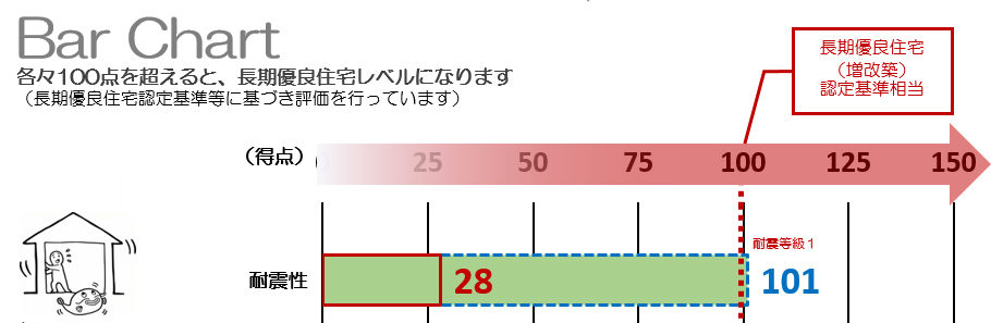 改修後の耐震性能![]() 耐震性 BarCrart 改修前28点 → 改修後101点(長期優良住宅レベル)耐震等級1以上 |