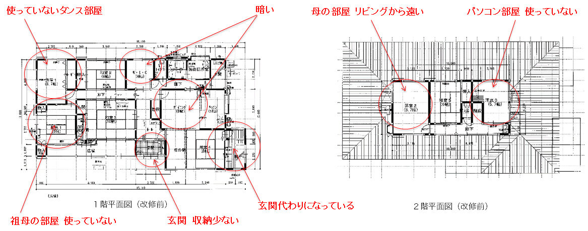 お母さんは特に要望はないが、娘夫婦は、「暗い、寒いをなんとかしたい、使いやすいキッチン、広い広間にしたい。デザインも明るく開放的にしたい。」との要望をお聞き出来た。