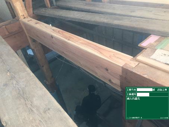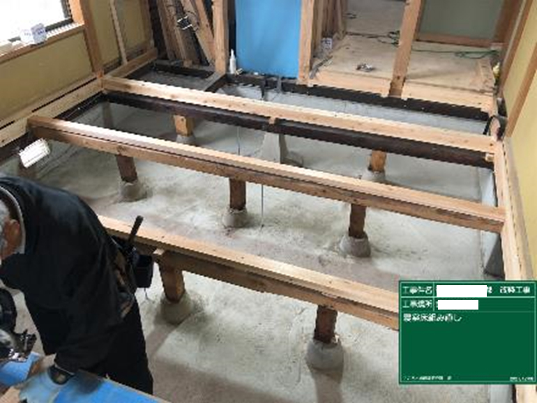 改修工事のポイントの一つに 下地調整がある。特に床下地は根太工法となっていることが多く、また床の仕上げに段差が多いこともある。最終仕上げの床高さに合わせて根太や大引の高さを考えて調整していく。構造は、柱を入れたり構造用合板で耐力壁をつくった。