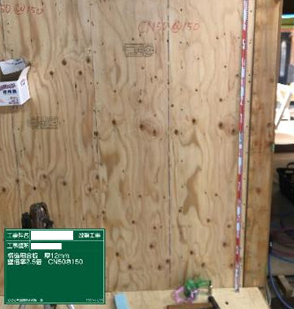 耐力壁 施工![]() 構造用合板 厚12㎜ 壁倍率2.5倍 CN50@150 |