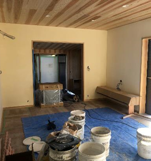 耐力壁や下地調整が終われば後は新築の要領で工事を進めていく。天井板、漆喰下地等、スピーディーに進んで行く。静岡県はリフォームに対しても優良木材利用の補助金制度があり、使用した木材量に応じて受けられる。