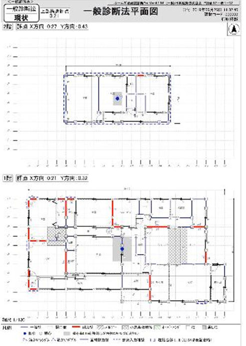 調査の結果、精密診断法による上部構造評価点は Iw0.28、南面に大きな窓が並び見た目にも不安を感じる住宅だった。既存建物の図面は有ったが筋違いの表記がなかったり、図面と現状の違いも有った。