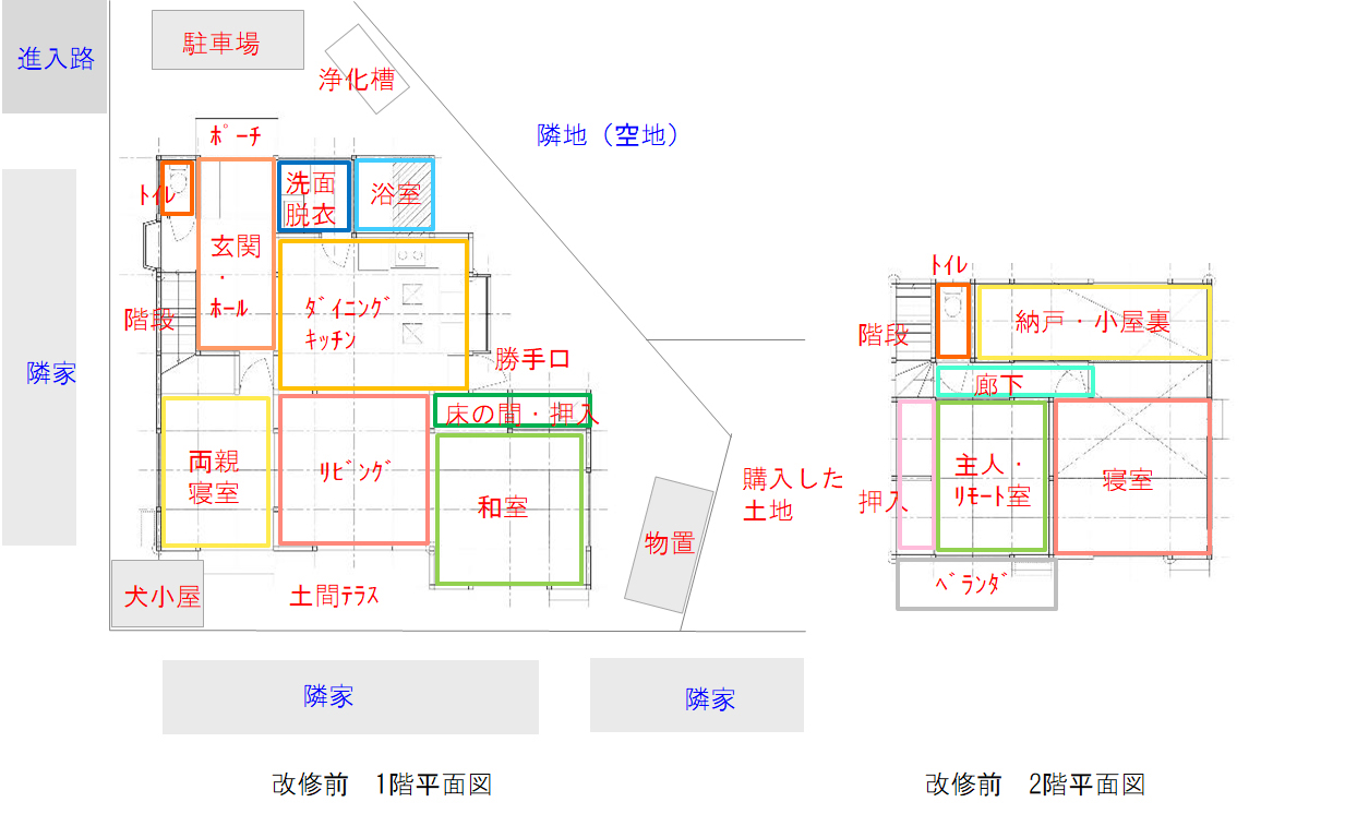 改修工事の図面は、改修前と後がわかりにくく2枚に分けて書くこともあるが、一枚でわかりやすく記載する事が現場は解りやすい。