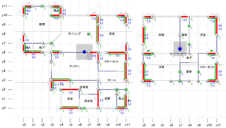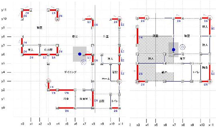 既存の建物は布基礎+在来軸組工法、耐力壁は筋交いが入っているものとして(確認申請図と現状間取りから推察)、外壁材(耐力壁)は不明確な為耐力を評価せず計算。