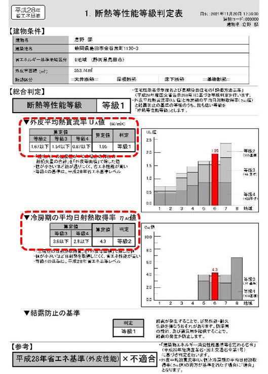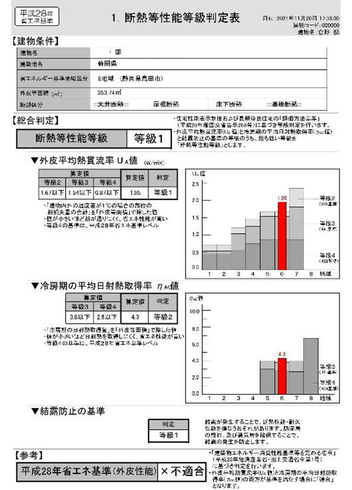 | 外皮性能 [現状] 外皮平均熱貫流率 UA値1.95 等級1 冷房時の平均日射熱取得率 ηAC値4.3 等級2 |