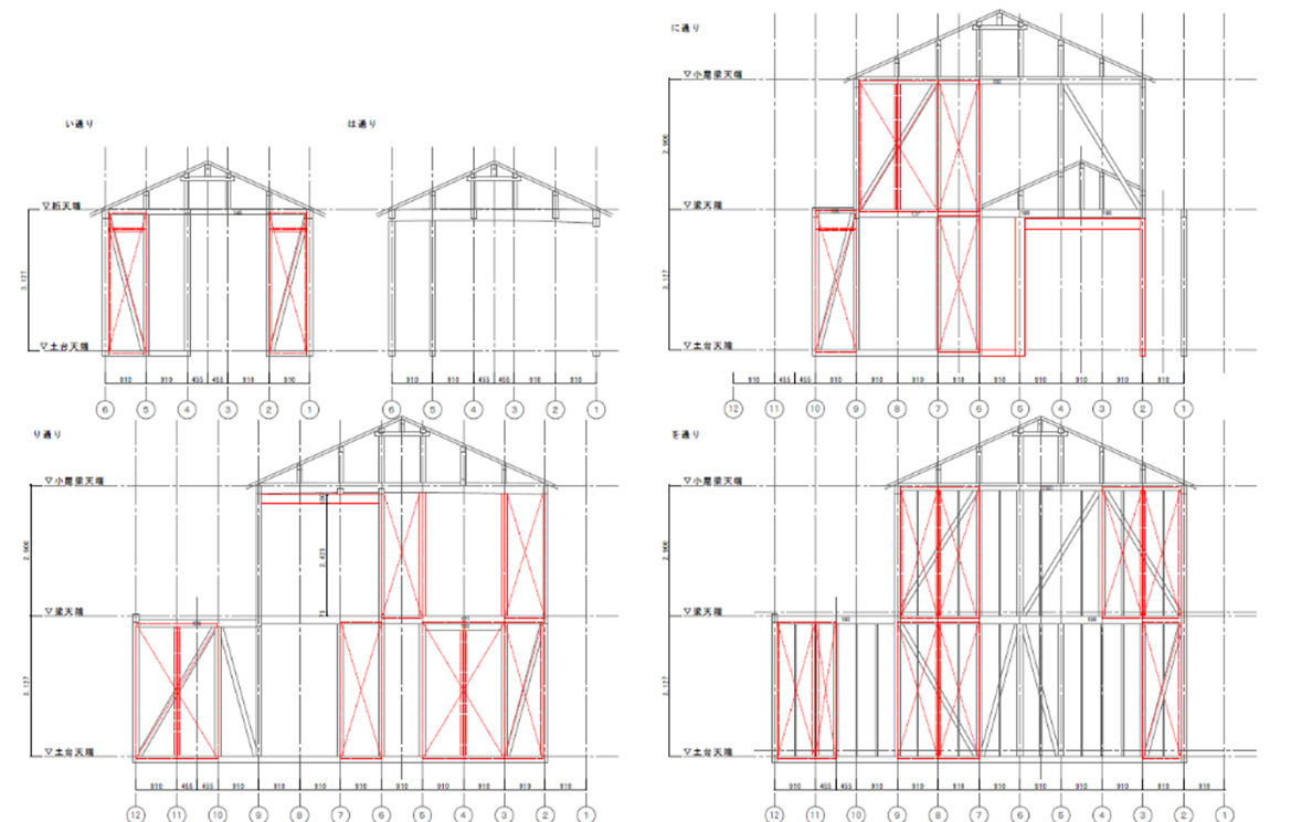平面や伏図では高さの字情報がわかりにくい。軸組図で梁の高さや合板の位置を示す事で一目で情報が伝わる。