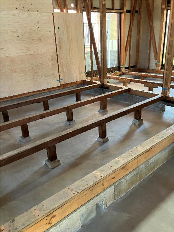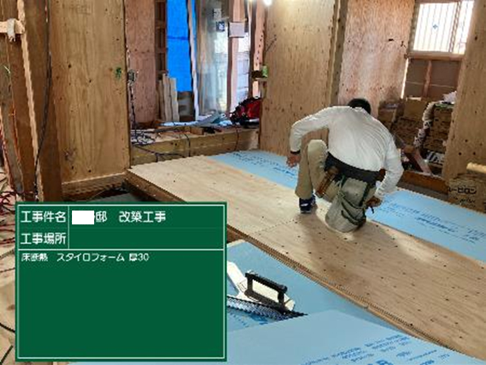 床下地の組み方に一工夫。根太まで撤去し、大引き間にボードタイプの断熱材を入れて床を24㎜合板で固定する。作業性も良く、性能も担保される納まり。