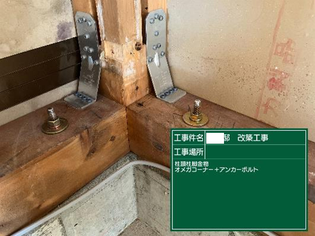■■新しい間取りに合わせた耐震壁を設置し、上部構造評価点1.0以上とする。柱脚金物、筋違い金物などの構造金物を設置する。