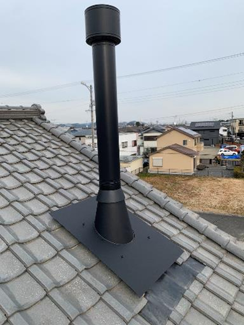 瓦屋根の煙突工事は納まりが難しい。薪ストーブ屋の経験を元に雨仕舞の良い施工を行った。