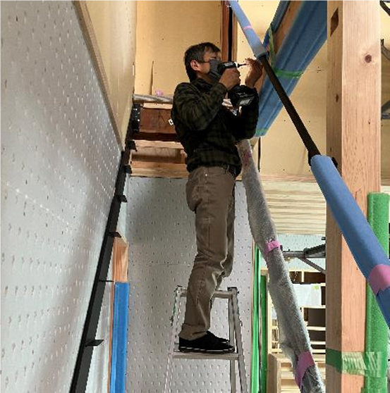 外周部の耐力壁は室内から 構造用合板12㎜を施工した。土台から床梁、床梁から小屋梁に確実に固定。継目の無い 3’x10’ 板を使用した。