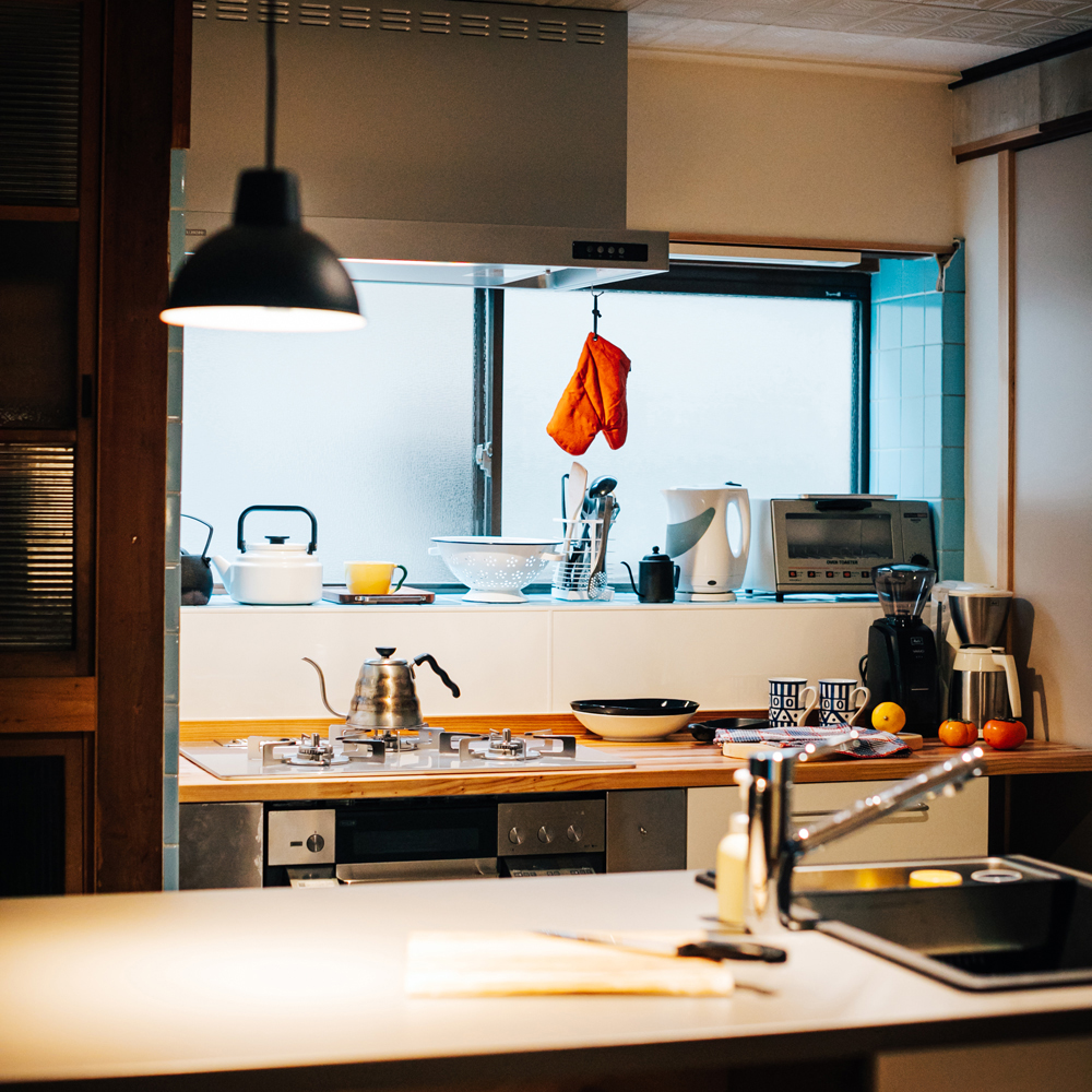 元旅館の大きな厨房は、飲食業用(区切りが必要となる専用厨房)とゲストの共有キッチンとしました。それぞれが使いやすいように流しを中央に配置。ゲストからは「使いやすい」と好評です。