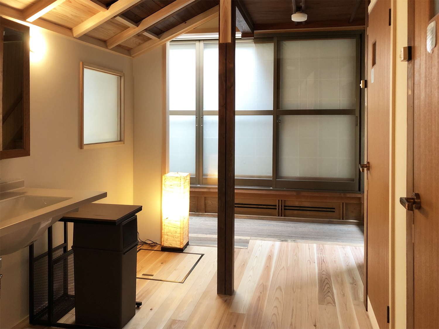 この事例の改修では、これまで学んできた耐震・断熱・気密に関してほとんど手が出せないまま終わってしまっています。真壁の外壁は柱の際から外光が入るほどの隙間があるまま、アルミサッシは単板ガラスのままです。数ヶ所の窓にハニカムブラインドを入れて抵抗してみてはいますが、恥ずかしいほど何もできませんでした。それでも滞在する宿泊客に喜んでもらえるための優先順位として水回りの改修は必須と考え、そこは可能な限り手を入れました。そして予算は尽きました。今回の物件は借家であり、補助金の採択を受けることができたため、自己投資分は5年で回収することを目標としています。設計者の立場だったこれまでと逆転して、事業を自ら興していく側になると逆算で投資額を決める、という割り切りも大切だと身をもって実感しながら、新たな挑戦を楽しんでいます。