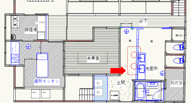 ![]() 洗面所の床と壁、軒の施工 |