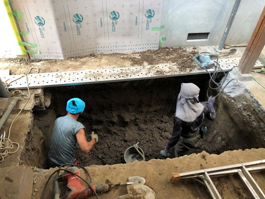 浄化槽が無かったため設置を計画。外部で唯一「設置出来そう」と話していた場所の一部が隣地であることがわかり。検討の結果、建物内 土間に設置することにした。