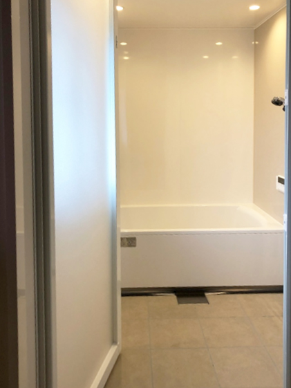 脱衣所の床は、傾斜があり傾きもバラバラでした。下地の調整でフラットな床に仕上がりました。また浴室は、そのまま使う事が難しかったため元旅館の大きな洗い場と浴槽の良さを生かしたユニットバスとしました。