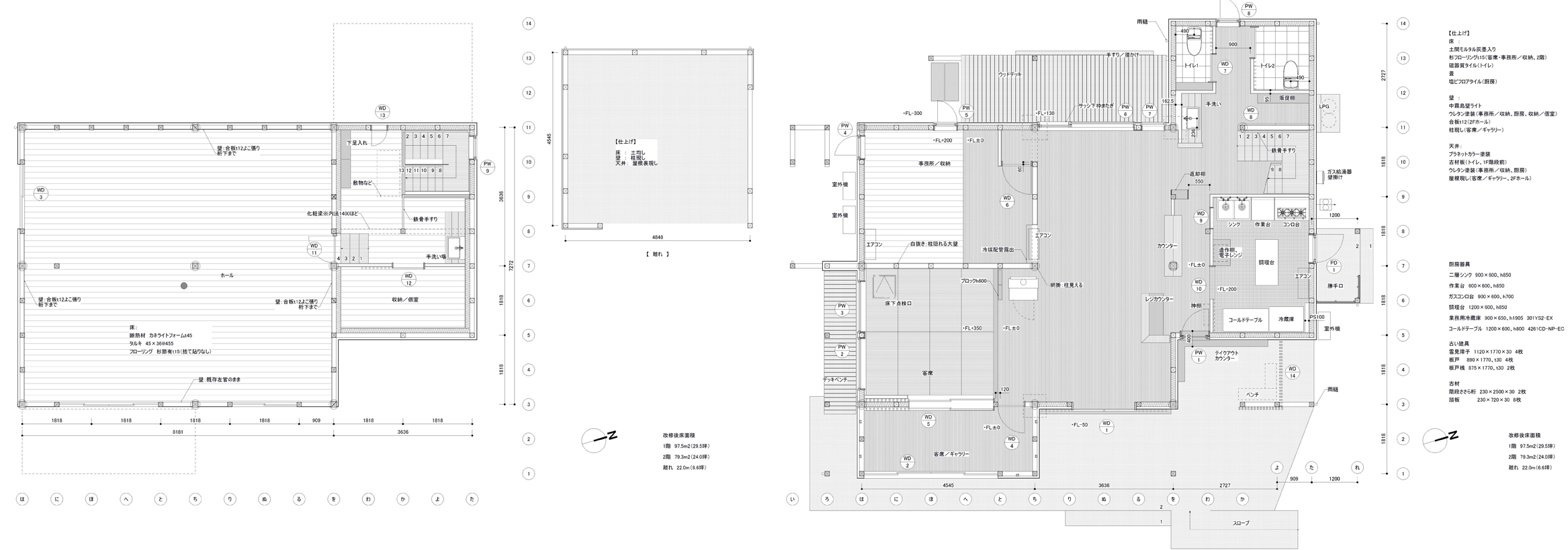 【設計の方針】 1 バランスのとれた性能向上をする ・耐震:積雪1.5m時 上部構造評点1.0以上 ・温熱:断熱エリアUa値=0.6以下(断熱等級5) ■ 2 店のコンセプトを表現する ・自然素材・無垢材の使用、建具・照明の再利用 ・景色を楽しめるプランニング ■ 3 はたらきやすい店にする ・客席が見渡せるゾーニング ・サービス動線の明確化 |