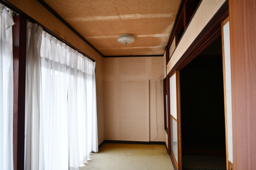 平屋部分を中心に、1階室内に雨漏り跡が多数。北側廊下部分は雨漏れにより天井が抜けている。