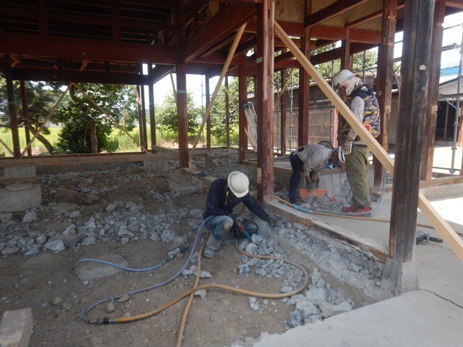 ・玉石をコンクリートで根巻きした既存基礎に、差筋をして新設基礎を接続させた。