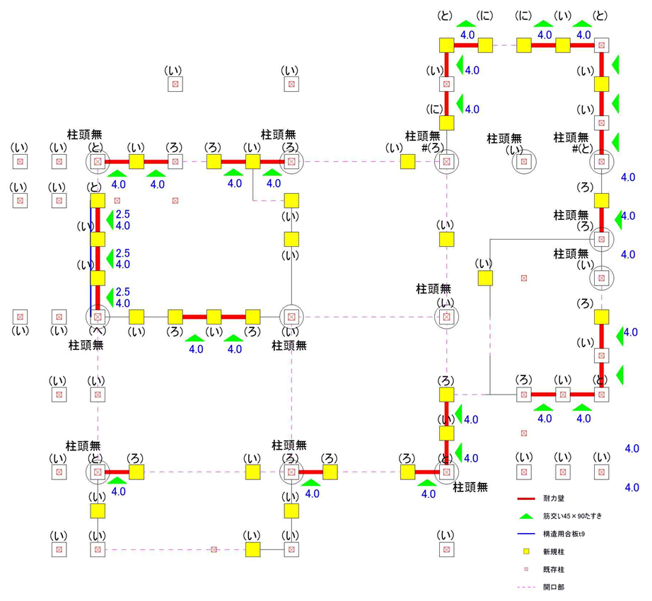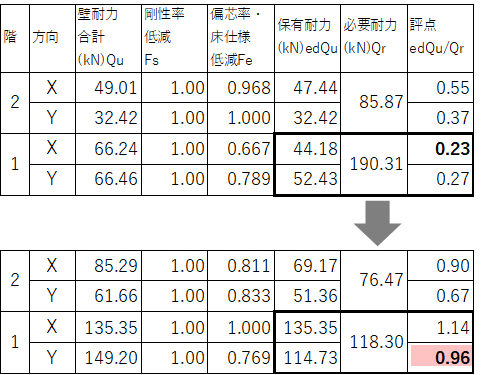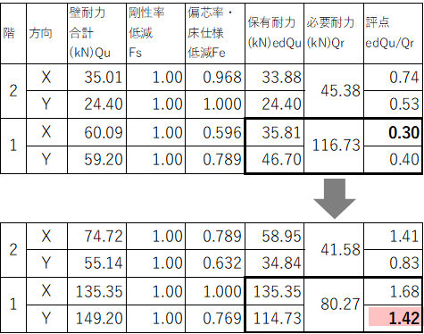 精密診断法による上部構造評点は、改修前Iw 0.30 ⇒ 改修後1.42(共に1階 無積雪時)