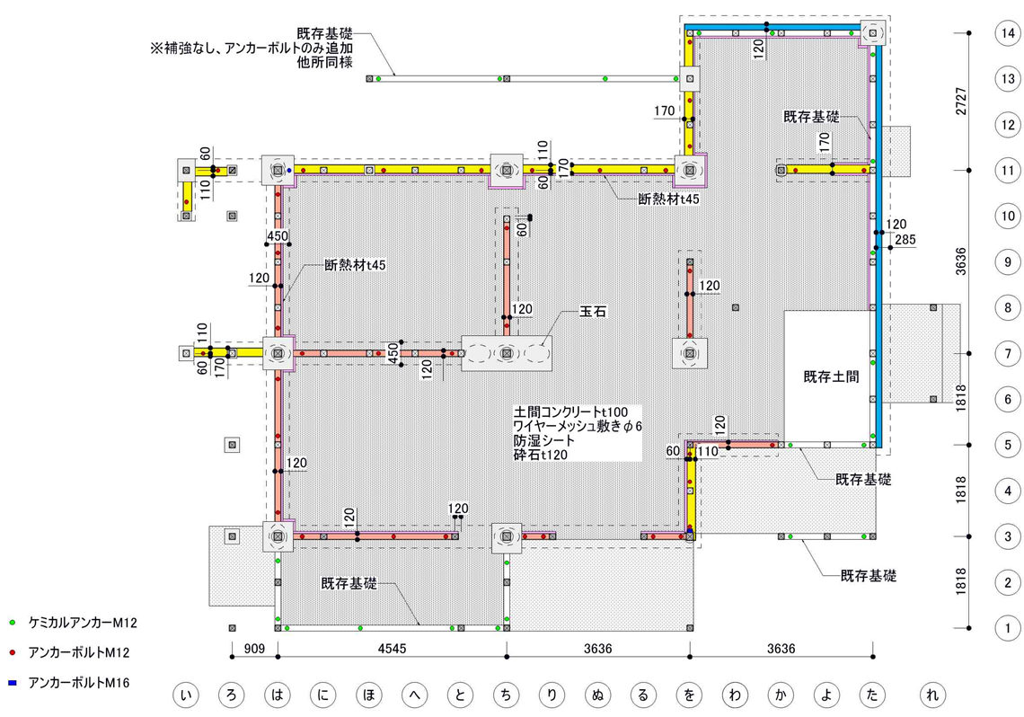 ・外周部は無筋コンクリートのため、抱き基礎を新設し、既存土台にアンカーボルトを追加した。
